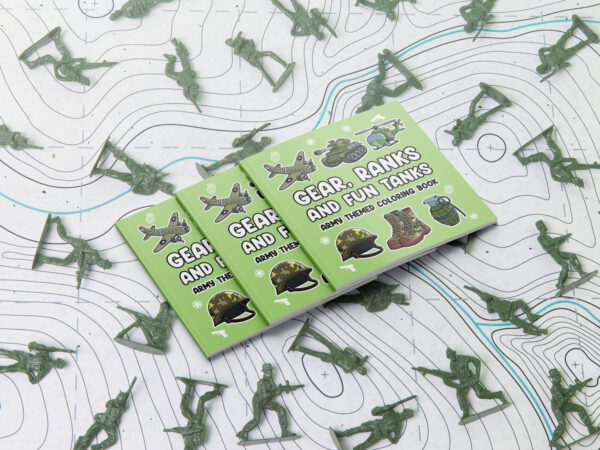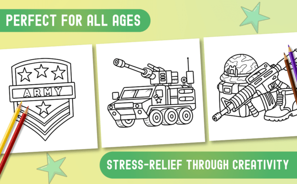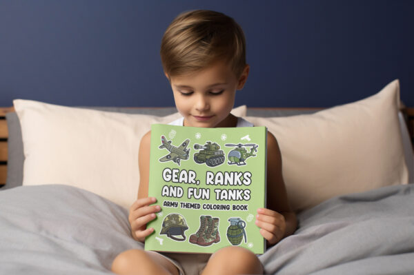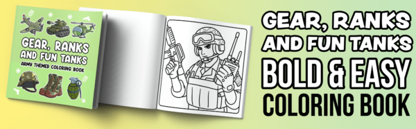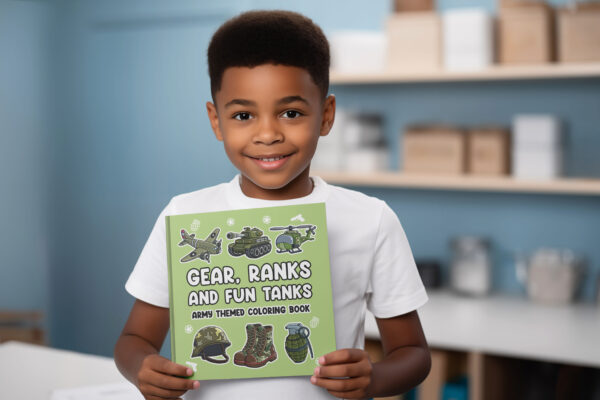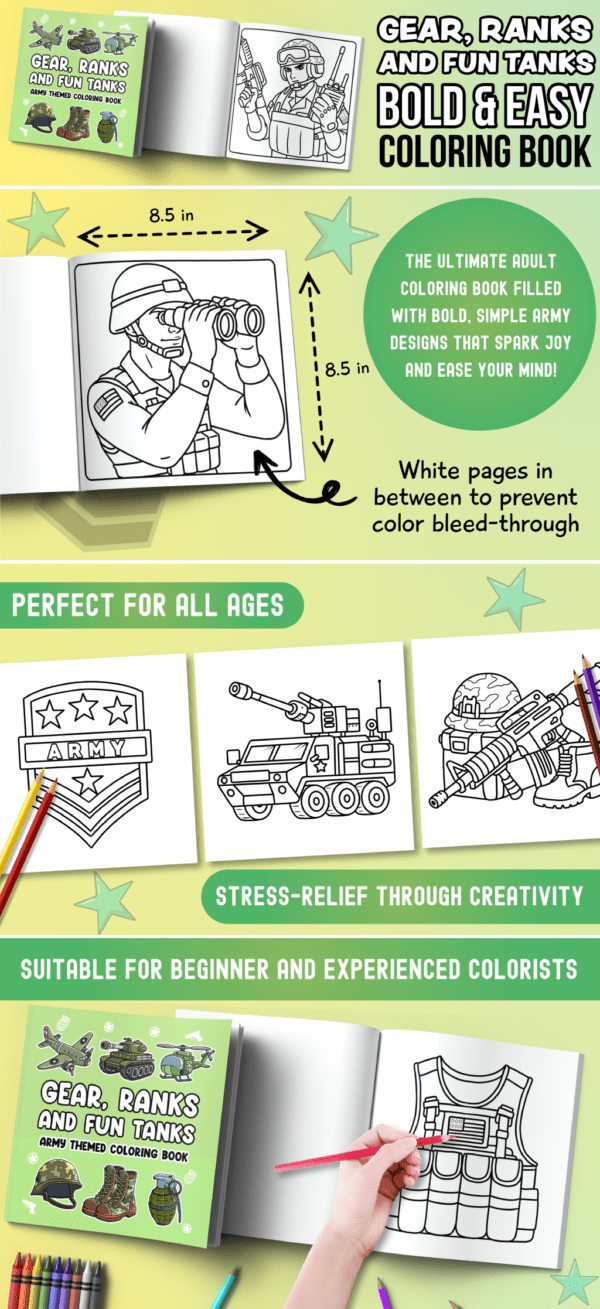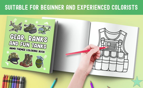 Unleash creativity with **Gear, Ranks, and Fun Tanks!**—the ultimate Army-themed coloring book for children ages 3 and up. With 55 pages of bold, easy-to-color designs, this book is perfect for both beginners and experienced young artists. Children and adults will enjoy coloring military uniforms, gear, radios, cannons, soldier scenes, armored vehicles, tanks, and ranks, offering a fun introduction to the world of the Army.